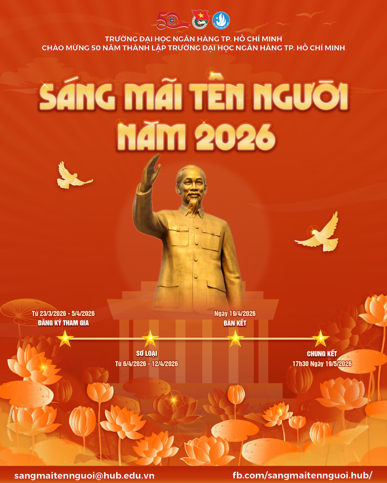🌟 Mỗi mùa tháng Năm về, trong dòng chảy thiêng liêng của lịch sử dân tộc, hình ảnh và tư tưởng của Hồ Chí Minh lại bừng sáng trong trái tim của bao thế hệ người Việt Nam. Đây là dịp kỷ niệm 96 năm thành lập Đảng Cộng sản Việt Nam (03/02/1930 – 03/02/2026), 57 năm thực hiện Di chúc của Hồ Chí Minh (1969 – 2026), đồng thời hướng đến 136 năm ngày sinh của Chủ tịch Hồ Chí Minh (19/5/1890 – 19/5/2026), 50 năm thành lập Trường Đại học Ngân hàng Thành phố Hồ Chí Minh (16/12/1976 - 16/12/2026). Những cột mốc ấy không chỉ gợi nhắc niềm tự hào về truyền thống cách mạng mà còn là nguồn cảm hứng để thế hệ trẻ trường Đại học Ngân hàng Tp.HCM tiếp tục học tập, rèn luyện và lan tỏa những giá trị tư tưởng, đạo đức cao đẹp mà Người đã để lại. image