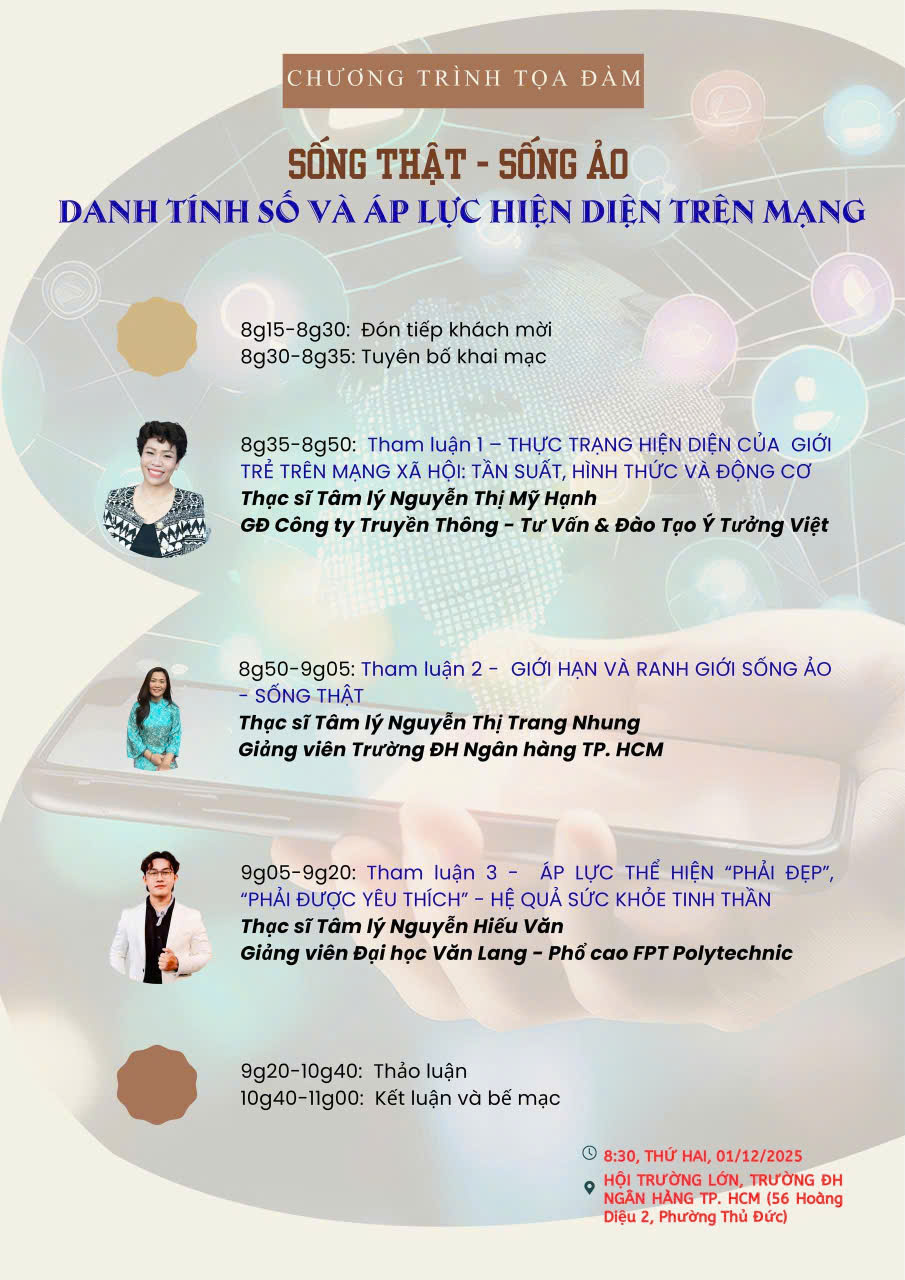 🎯 Buổi tọa đàm khoa học được tổ chức bởi Khoa Khoa học xã hội trường Đại học Ngân hàng TP. HCM với chủ đề: “Sống thật - Sống ảo, Danh tính số và Áp lực hiện diện trên mạng”. sẽ mang đến những góc nhìn thực tế, những chia sẻ chuyên sâu và giải pháp thiết thực giúp người trẻ hiểu rõ hơn về giá trị bản thân trong kỷ nguyên số.